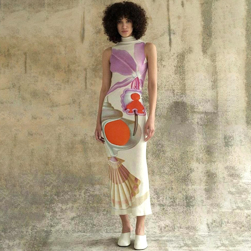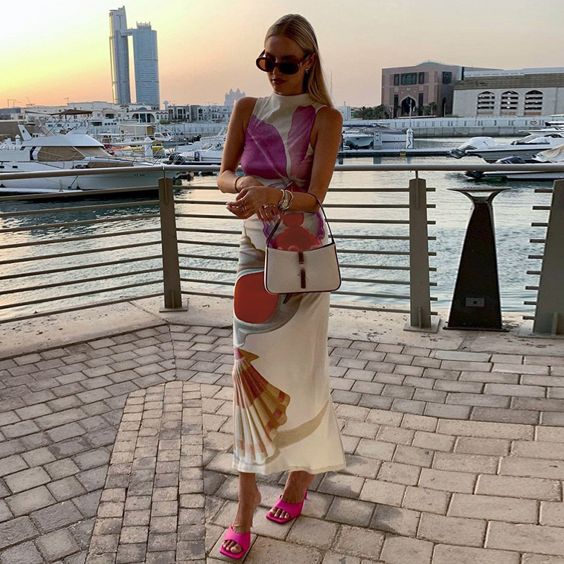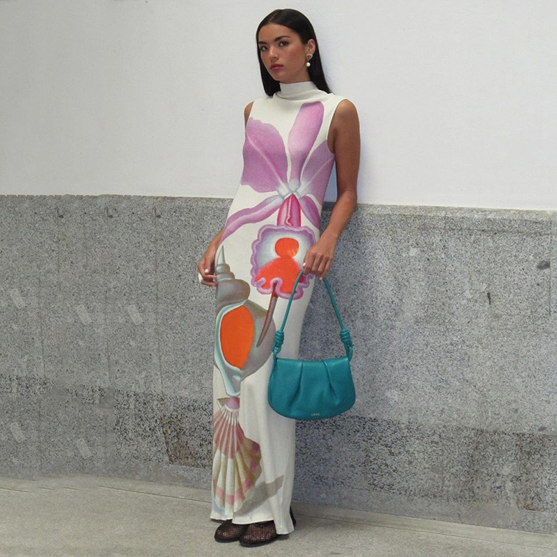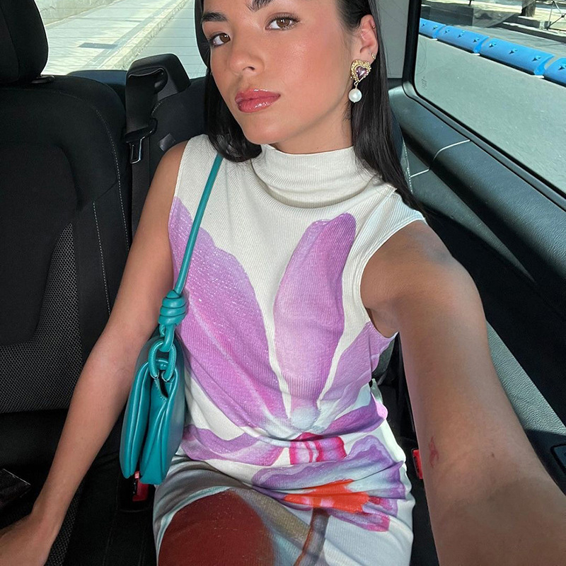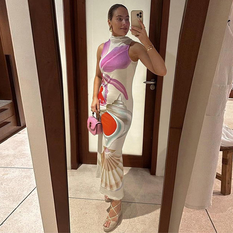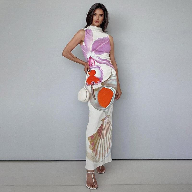 Printed Half Turtleneck Slim Fit Long Dress